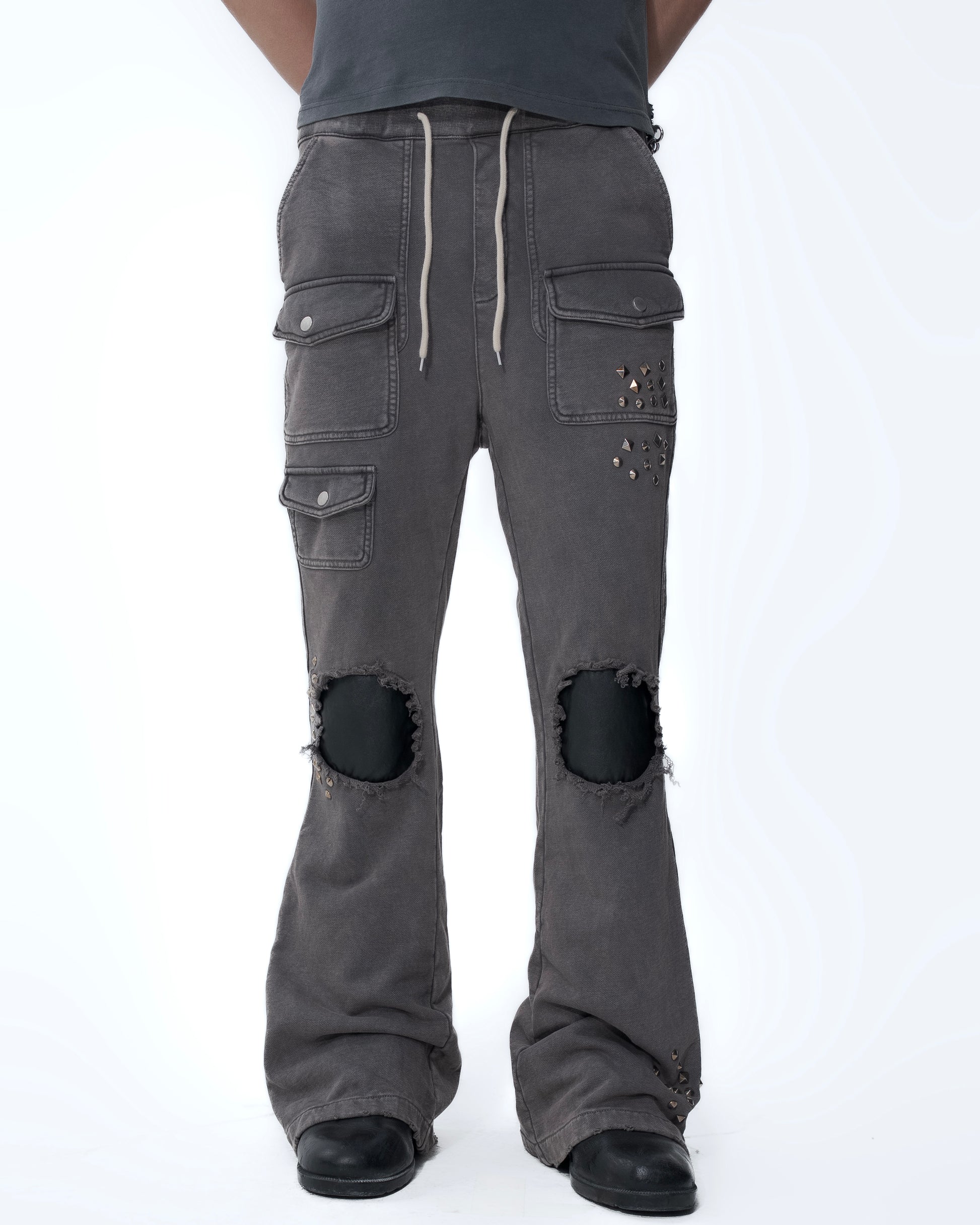 Built to stand out and feel premium, the Osiris Sweatpants are cut from 100% French Terry cotton in a heavyweight 400 GSM build, finished with a slightly flared fit for a clean stacked silhouette. Designed with lambskin layering, metal studs, and intentional distressing that gives every pair a worn-in, lived-with edge. Unisex fit, true to size—made to wear hard and age even better.